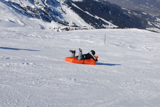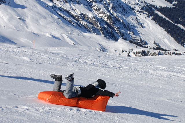 Our daredevil Curt races down Pizol mountain on an Ambient Lounge Conversion Bean Bag. Skiing has never been so comfortable!