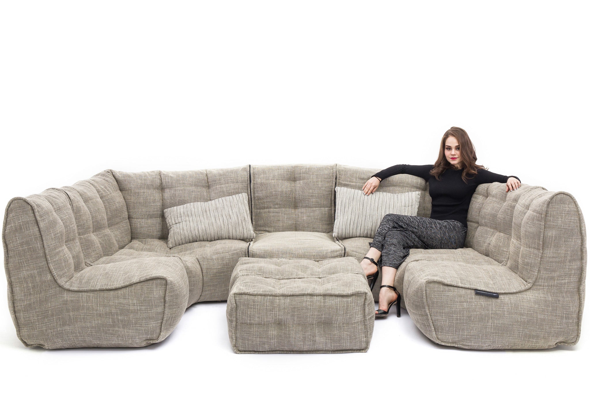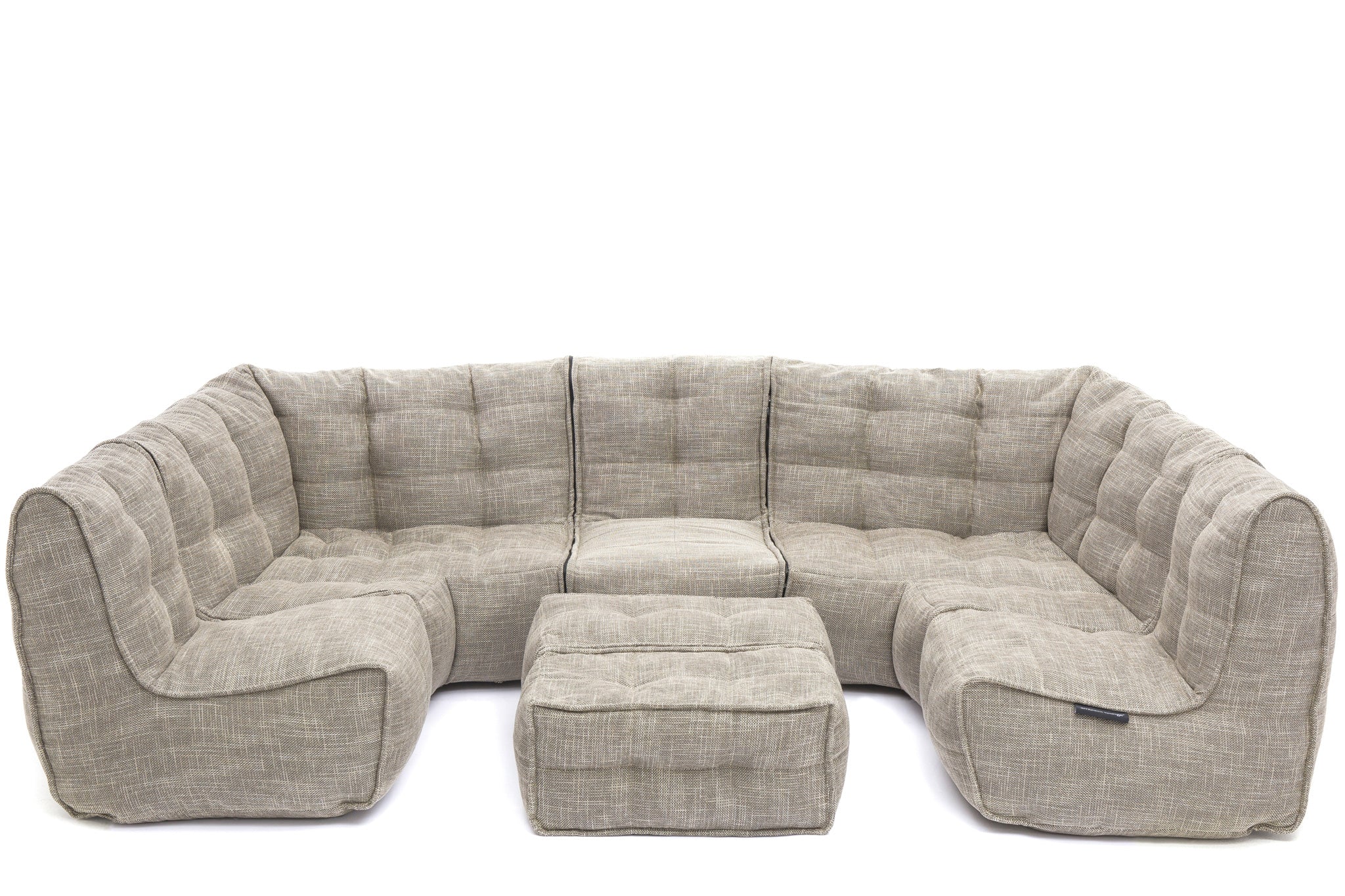 The MOD 6 Lounge Max in Eco Weave defines high-end modular furniture. This maximalist 6-piece set features a premium tan and cream weave. Outperforming all standard bean bag materials, it provides a sophisticated, structured look for large living spaces, offering understated luxury and relaxed, superior comfort for the whole family.