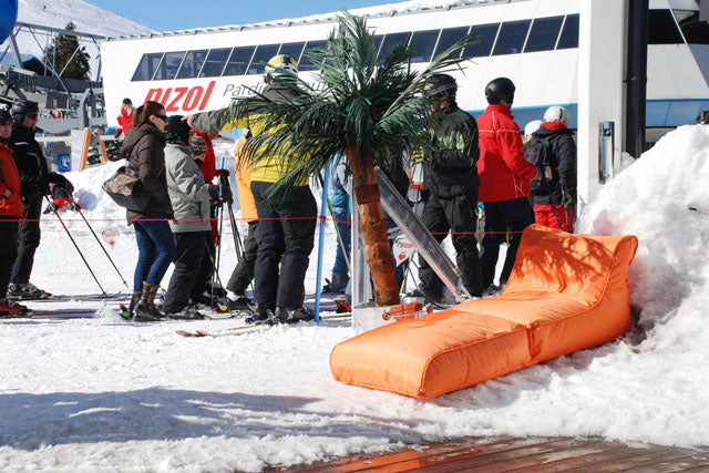 Our daredevil Curt races down Pizol mountain on an Ambient Lounge Conversion Bean Bag. Skiing has never been so comfortable!