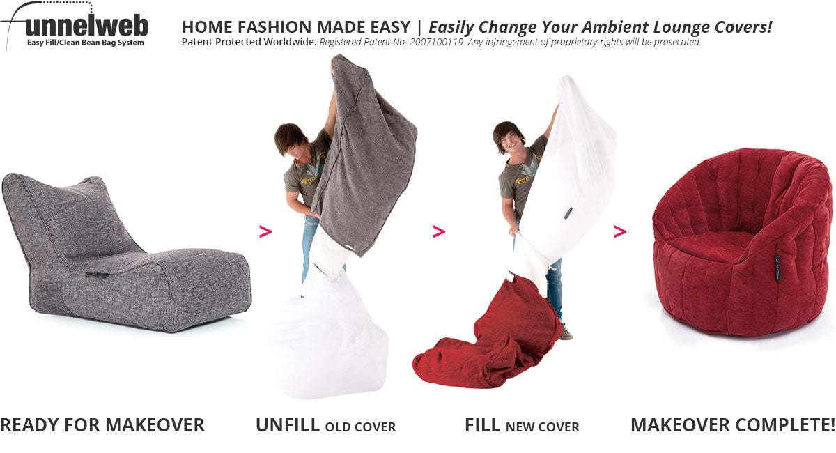 No more 'spilling the beans'! The Funnelweb™ is a revolutionary patented system designed exclusively by Ambient Lounge for hassle-free bean transfer when filling or emptying your bean bag sofas. Enjoy the safer, quicker and easier way. Only with Ambient Lounge.