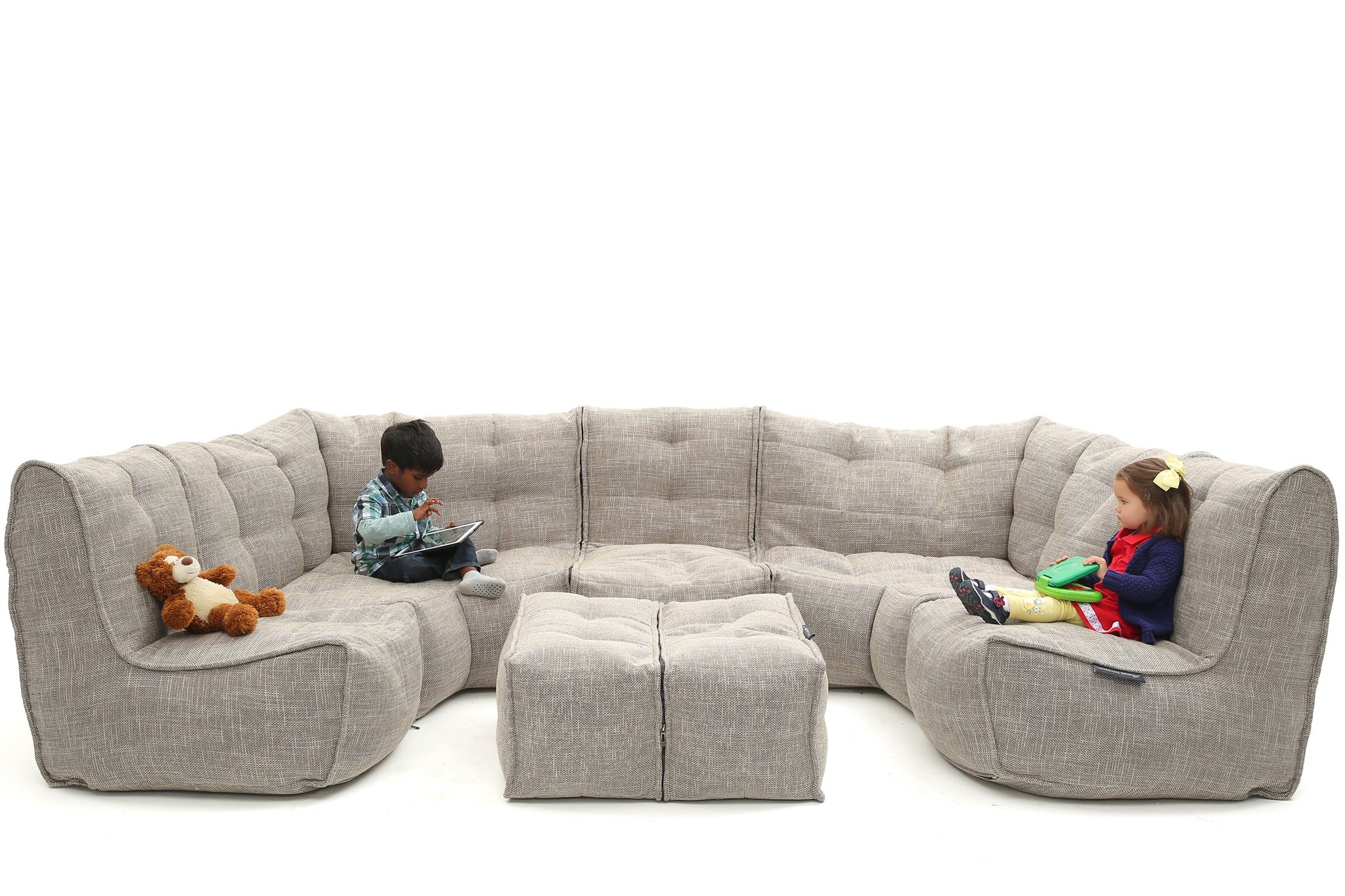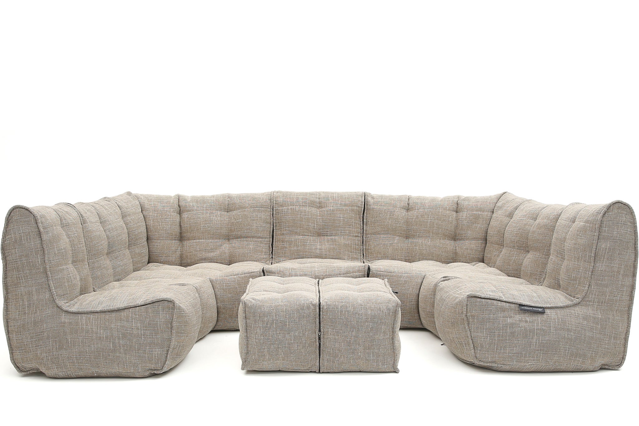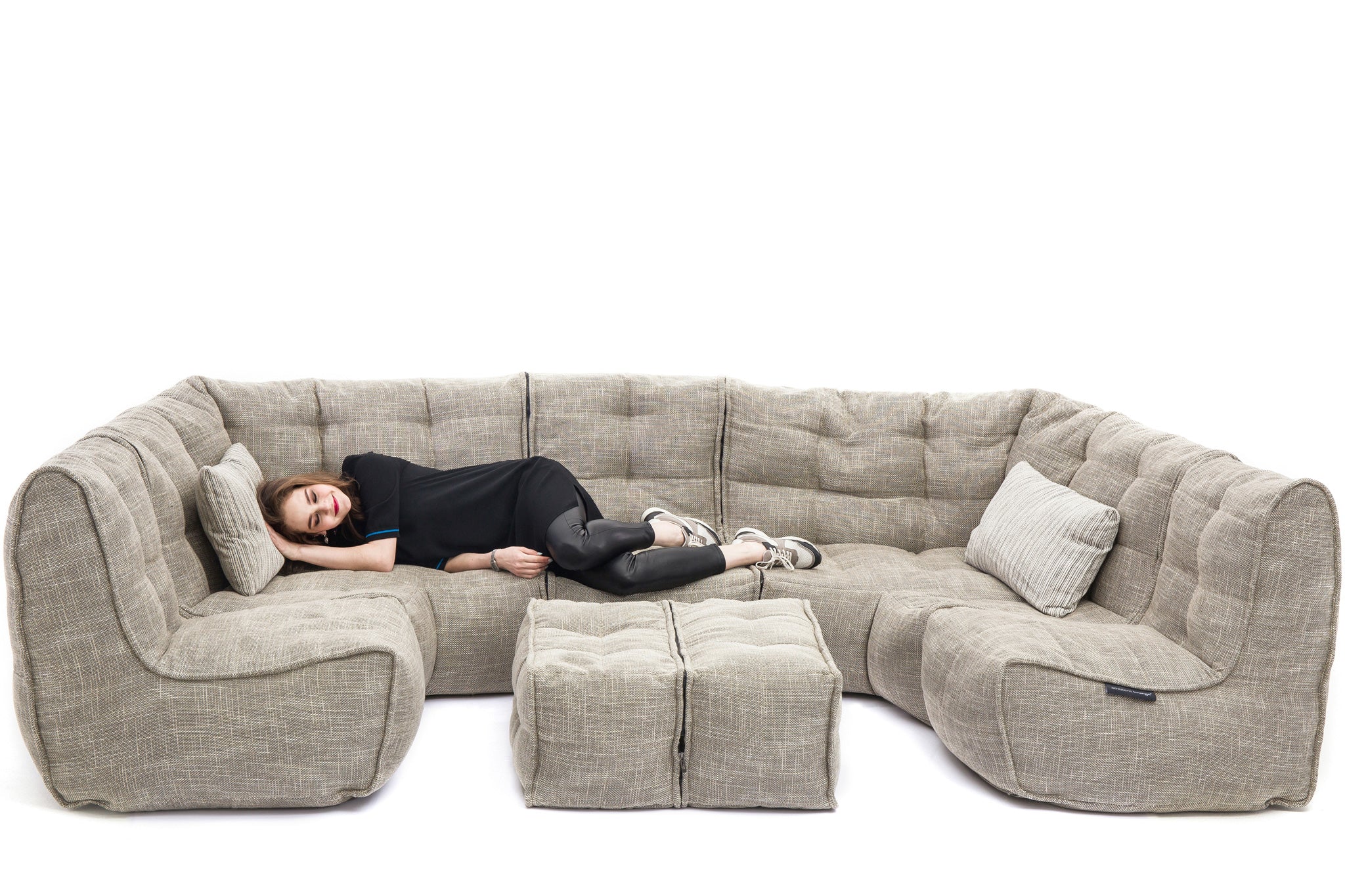 The MOD 6 Lounge Max in Eco Weave defines high-end modular furniture. This maximalist 6-piece set features a premium tan and cream weave. Outperforming all standard bean bag materials, it provides a sophisticated, structured look for large living spaces, offering understated luxury and relaxed, superior comfort for the whole family.