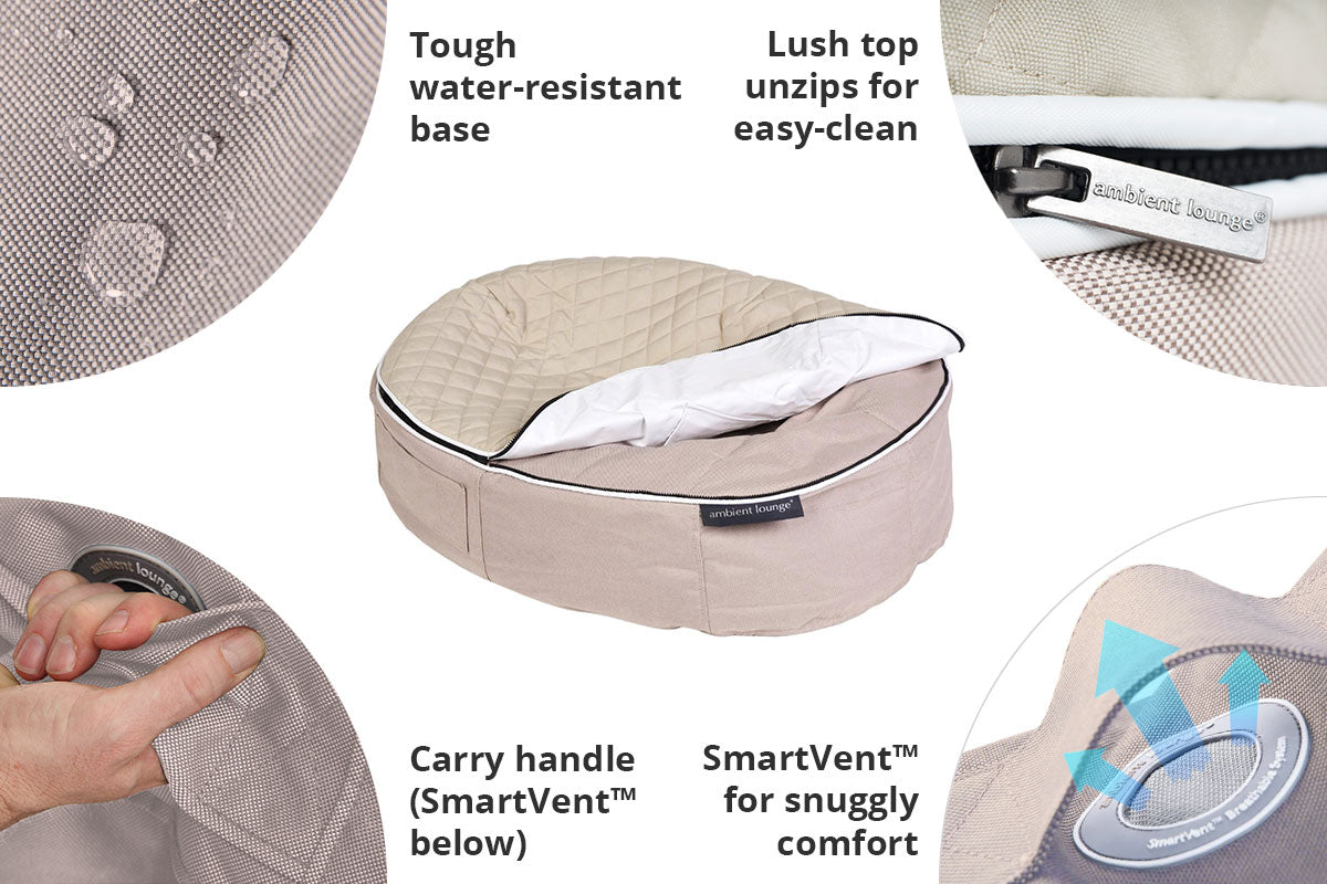 In addition to the soft and weightless comfort of bean-filled bedding, the lush quilted sleeping area allows the dog to sink into the soft surface and feel secure within the outer walls. Being highly rated and used by the Guide Dogs Association of Australia is testament to Pet Lounge's unrivalled quality and comfort. It's so comfortable your family members might start using it too! With the luxurious CoolQuilt, your dog will snuggle up and revel in the feeling of velvety smooth comfort. If your dog sleeps outdoors, this is also the ideal outdoor dog bed. It's perfect for picnic trips too!