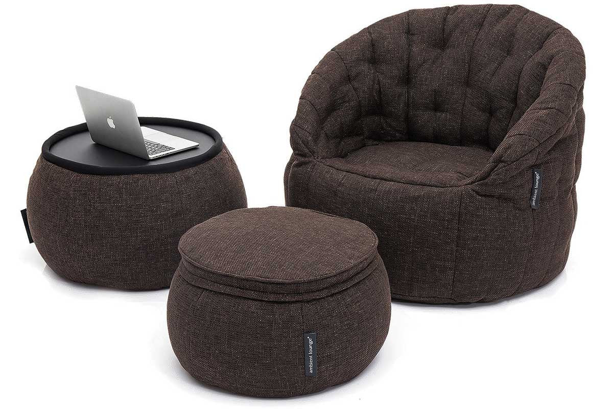 A beautiful ensemble of luxurious chocolate fabric with a sleek black top, this multifunctional bean bag table looks stunning in any setting.